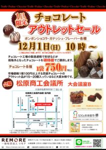 12月1日(日)に松原市の「松原商工会議所」様にてチョコレートのアウトレットセールを開催いたします。